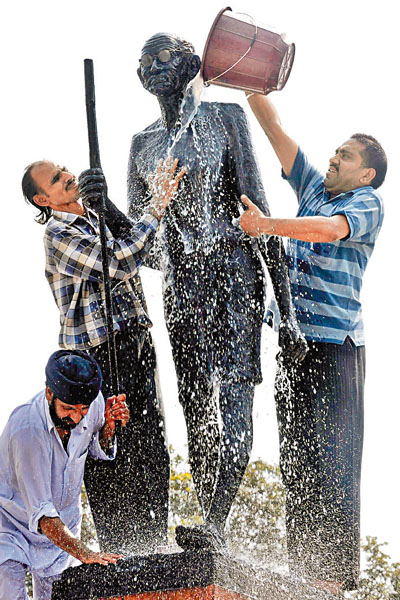 ■印度國會議員為了紀念甘地誕辰140周年,10月1日那天,用牛奶澆淋甘地的雕像。