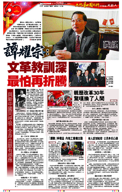 新中國迎來60華誕,全港各界團體由8月份開始,已一個接一個地舉辦慶國慶活動,令許多人都忙不過來。不過,回望60年前的香港,那時搞國慶活動只是「小圈子」人的特別活動。譚耀宗坦言,香港人在回歸12年來,已有很大的變化,層面亦寬了許多,「現在搞活動,大家都會起立唱國歌,懂得面向國旗,以前不會有這些東西。」