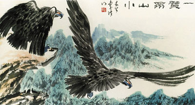王書平的「一覽眾山小」畫於津門,墨氣淋漓、神韻流轉,畫中兩隻雄鷹栩栩如生,其中一隻於空中展翅翱翔,另一隻則立於山崖,俯視翠綠群山,流露畫家對祖國山河的無限熱愛。王書平畢業於天津美術學院,是著名畫家孫其峰入室弟子,現為中國美術家協會理事,天津市美術家協會副主席,他曾出版《王書平花鳥選》、《王書平作品選集》等。