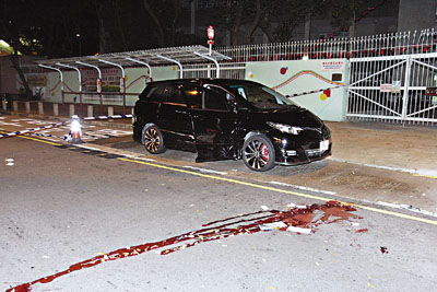 ■一名青年將7人車停在粉嶺一鳴路巴士站路旁遇襲,地上遺下大量鮮血觸目驚心。