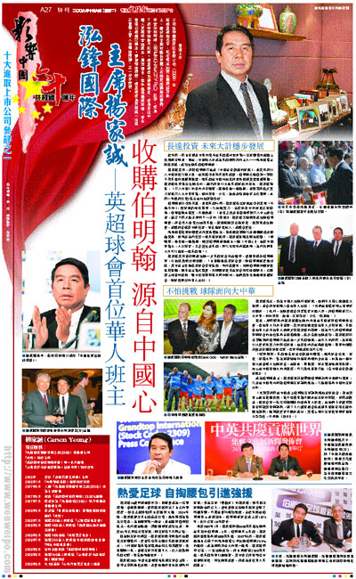 香港上市公司泓鋒國際控股有限公司(2309)主席楊家誠的名字,近年時常出現在國際體育版上,源於他全面收購在英國上市的英格蘭超級聯賽球會伯明翰城(BIRMINGHAM CITY PLC)股份,成為了該球會的最大股東。楊家誠成功創造歷史,成為首位中國人英超球會的班主,萬眾矚目;事件轟動國際球壇,並在香港引起廣泛關注。夢想照進現實,楊家誠成為英超第一位真正意義上華人老闆的憧憬,正一步步實現。