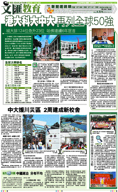 【本報訊】(記者 任智鵬)香港高等教育再獲世界肯定!在由英國《泰晤士報高等教育》與國際高等教育資訊機構Quacquarelli Symonds合辦的「THE-QS世界大學排名2009」中,香港大學、科技大學及中文大學等3所大學,繼去年後再次同時位列全球50強,其中港大及科大分別排第24及35位,均較去年有所上升,而中大排第46則比08年略降4位。此外,城市大學亦取得不俗成績,全球排名124位,比去年急升23位。
