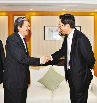 新任金融管理局總裁陳德霖履新,和身為財爺的曾俊華來一次官式會面是必要禮節。不過,由於曾俊華日前因急性心臟病發留院治療,令陳德霖直到昨日,才能正式與曾俊華正式會面。曾俊華在是次會面中表示,期盼與陳德霖衷誠、緊密合作。