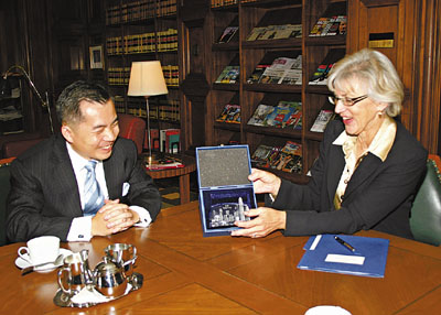 律政司司長黃仁龍展開在加拿大的3天訪問,他將拜會法律和司法界高層人士,介紹香港的法治情況和香港在亞太區內作為仲裁中心的發展。圖為黃仁龍送紀念品予加拿大首席大法官麥拉克琳。 ■本報記者 鄭治祖