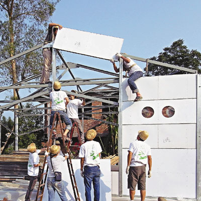 工程之所以能在短短14日完成4座樓房建設,亦因為應用了靈活的建築流程。朱競翔先委託不同廠家製造不同的配件,例如鋼架、牆壁、屋頂等,各公司同步生產,能同於開工日運抵到工地進行組裝。他介紹指,有關設計的外牆雖僅16厘米厚,但用了4層能防火、隔開外界溫度、防水及鞏固房屋的物料,可達到舒適的效果;而窗戶也有別於一般平排設計,由於在不同高度開窗,對鋼架的力度不構成影響,又能達到通風的效果。另建築團隊又在輕鋼框架的材料及表面塗上保護層,其壽命最少可達20年,而由於用螺絲作連接,即使日後拆除也可再遷往其他地區重新安裝,不會產生廢物。