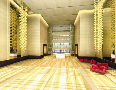 大廈入口大堂寬敞高聳、氣派不凡。