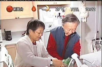 ■高錕在妻子引領下洗菜準備晚餐。有線電視畫面