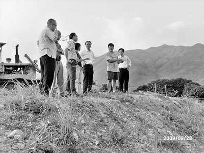 ■運輸及房屋局副局長邱誠武(右三)九月二十三日到菜園村,與受廣深港高速鐵路項目影響的村民見面,聽取他們的意見。