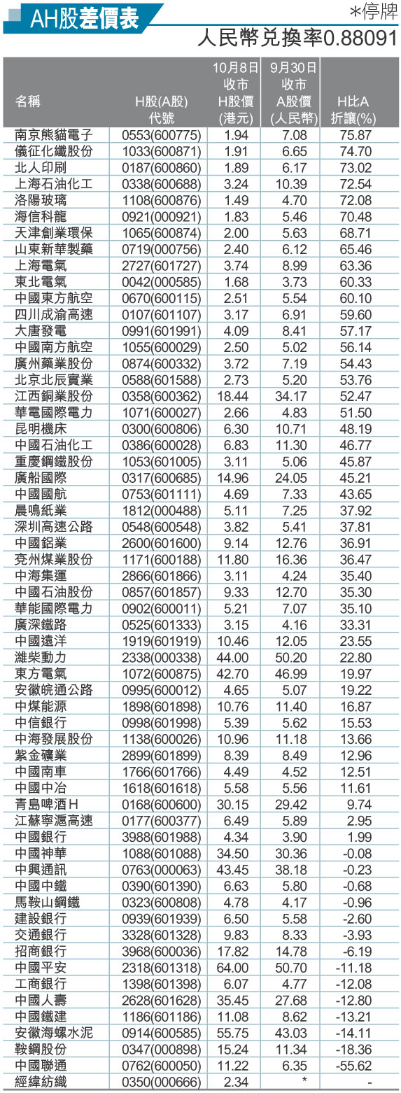 AH股差價表(10月8日)