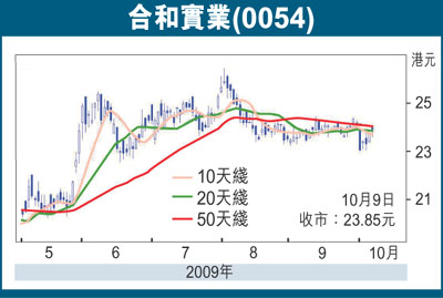 合和實業(0054)自8月中以來一直處於窄幅上落的局面,就以上周股價走勢而言,便主要在23/24元的區間上落,最後以23.85元報收,全周計逆市跌0.35元或1.45%,面對上升的大反彈市,該股表現無疑跑輸大市,但卻提供了低吸博反彈的良機。合和較早前截至今年6月底止全年度業績,錄得營業額上升5.7%至9.68億,純利則因未如上年度同期錄得一次性巨額特殊收益入帳下,倒退71.9%至16.8億元,派發末期息58仙。