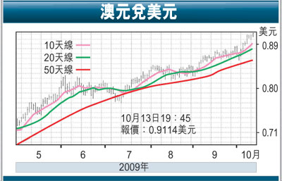 澳元上周在86.40美仙附近獲得顯著支持後,其走勢已持續趨於偏強,在迅速向上衝破89.00美仙水平後,已進一步往上突破90.00美仙關位,並且更一度於本周二反覆走高至91.25美仙附近的14個月以來高位。由於澳洲央行於上周升息4分之1厘後,市場已不排除澳洲央行將可能於第4季續有升息行動出現,因此在息差因素仍頗為利好澳元的情況下,澳元兌美元的升幅遂繼續有所擴大,預期澳元將反覆向上衝破92.00美仙關口。