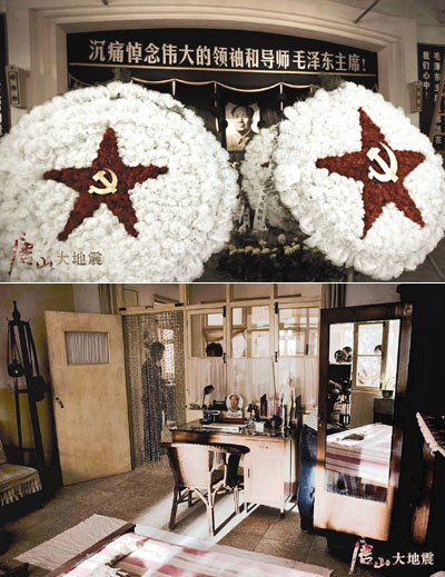 片方負責人表示,對於拍攝毛主席逝世追悼會的準備工作,堪稱「一個小奇跡」,不僅使用「絕版」道具以求完美,更利用真實物品重現歷史原貌。拍攝毛主席逝世追悼會製作的道具花圈,由於不具有70年代的質感,導演便全部否決要求重新製作。為此,劇組緊急從北京購買原料,並從八寶山及天津殯儀館分別請來兩位老師傅,以及兩位北影廠的老道具師,帶領劇組全體工作人員連夜手工趕製,才在預計拍攝時間之前重新製作了40個道具花圈,極其敬業的馮導這才表示通過,並笑言:「非常滿意!」