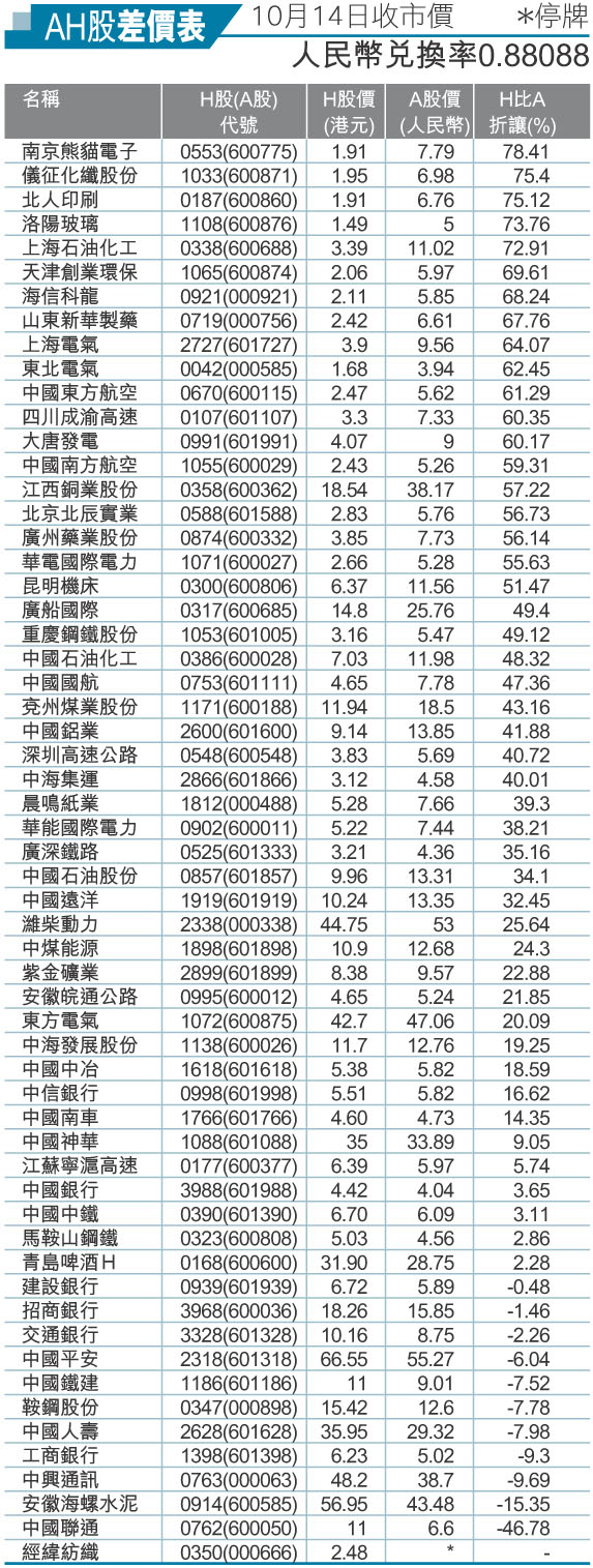 AH股差價表(10月14日收市價)