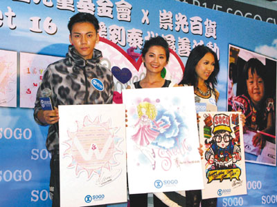 【本報訊】「送暖到泰北」慈善活動近日請來多位歌手設計圖畫,以製成紀念品作義賣。昨日參加設計的蔡卓妍(阿Sa)、陳偉霆及鍾舒漫就齊齊現身銅鑼灣鬧市,為活動主持啟動禮,而主辦的Sogo更送上蛋糕,慶祝分別於11月21日及22日出生的陳偉霆和阿Sa生日。