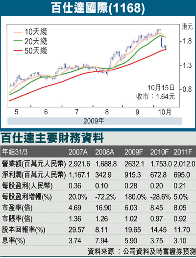 百仕達國際(1168)今年上半年業績優異,錄得純利4.98億元,按年增567.7%,每股基本盈利15.16港仙。利用此機會,公司在7月和10月兩次集資,淨額度共達到10.17億港元。公司目前手頭持有現金43.35億港元,有充分的條件向外收購項目或者地塊,而管理層也表示正在洽談收購事宜。我們對公司目前定位高端房產開發,增加商業物價比重的做法表示贊同,料日後公司的現金流將更加穩定。鑒於目前公司股價較淨資產折讓34%,具較大長線投資價值,給予公司買入評級,目標價2.1港元。