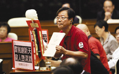 社民連3丑大鬧議事堂,累得保安員撞到檯角,「扯甩皮肉、拉傷韌帶」,肇事者長毛梁國雄發表假道歉、真卸責的聲明,企圖混淆視聽不特止,其黨友癲狗黃毓民(小圖)更是惡人先告狀,盡顯賴皮醜態。他在立法會先是大罵記者,續而怒罵反對派同道中人,聲稱白鴿黨(民主黨)人棒打落水狗;反對派中人對此反應冷淡,懶理他大噴口水,由得他唱獨腳戲!