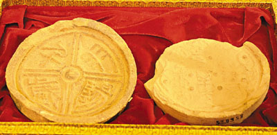 ■「羽陽千歲」瓦當(左圖)與「天下康寧」十二字瓦當(右圖)。 本報河南傳真