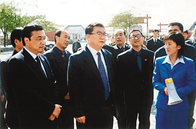 ■中央政治局常委李長春(中),中央政治局常委、國務院副總理李克強(左一)視察中國文字博物館建設情況。