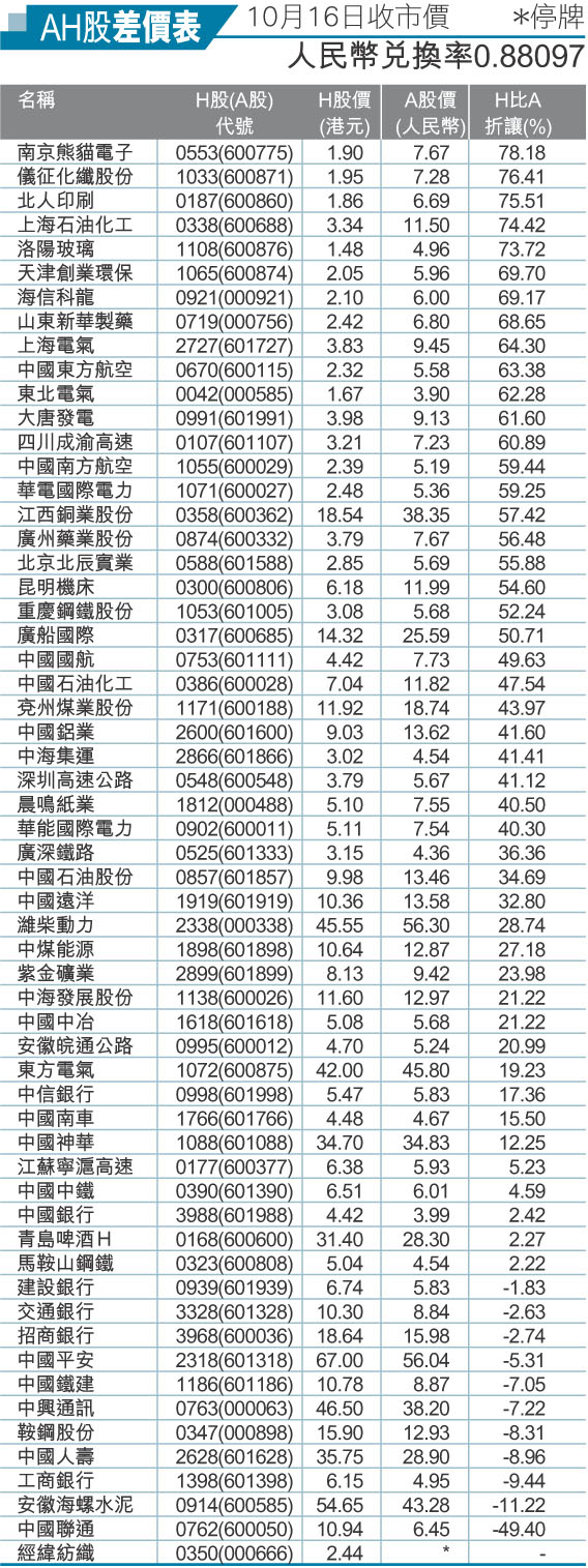 AH股差價表(10月16日收市價) (2009-10-17) (圖)