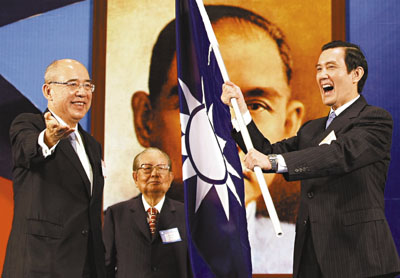 ■中國國民黨17日召開第十八次全黨代表大會,馬英九正式接任中國國民黨黨主席,並從前黨主席吳伯雄手中接過黨旗。 法新社