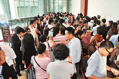 ■施政報告後首個樓盤推出,投資者「豪情」再現,人群擠滿輪候參觀峻弦示範單位。 本報記者張偉民 攝