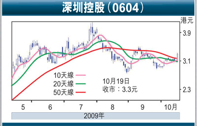 高盛最近推出的研究報告,也因應深控的物業落成時間,把其09至11年度每股盈利預測提升3%至6%﹔又指該股現價比每股資產淨值折讓36%,2010年度市盈率12倍,市帳率0.9倍,比H股同業平均有折讓,因此估值吸引。高盛微升深控的目標價,由4.68港元上調到4.70港元,建議買入。可趁股價技術走勢向好跟進,博反彈目標為年高位的4.14元。