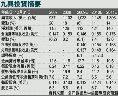 九興控股(1836)公佈了09 年3季度業務最新情況。我們注意到現在鞋類製造的品牌客戶對於需求前景更加樂觀。鑒於趨勢向好以及庫存水平較低,我們預測4季度製造業務收入僅會同比下降4.5%。上半年公司調整了零售網絡並於3季度恢復了擴張。我們將目標價由13.80港元上調至17.45港元(昨收14.5元),評級由持有上調至買入。