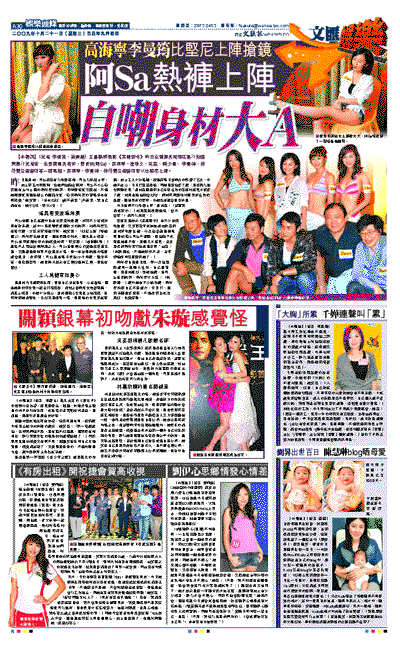 昨日吳君如、阿Sa都沒有以泳裝亮相。阿Sa以熱褲上陣,加上穿五吋高跟鞋,當她們拍攝合照時,阿Sa不小心碰到擁有34吋上圍的高海寧的胸部,即時面紅紅又尷尬,不過她謂面紅是因為臉上的胭脂太紅,碰到高海寧的豐滿身材有何感覺?她笑言:「身材好好,(羨不羨慕?)不羨慕,我自己都有啦,她大D咯,我大A咯。」