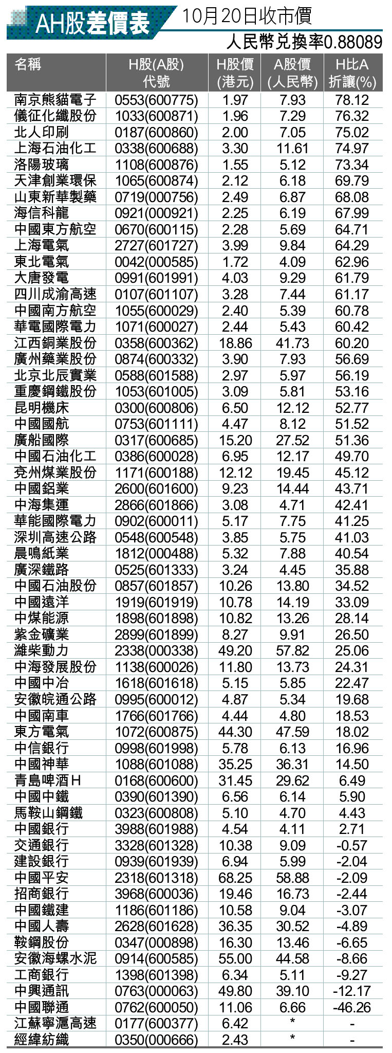 AH股差價表(10月19日收市價) (2009-10-20) (圖)