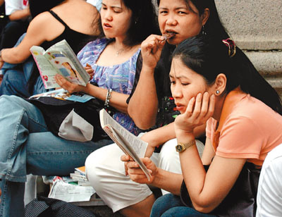 ■現時全港有近30萬外地家傭,每逢周日,她們都愛到中環皇后像廣場聚會。資料圖片