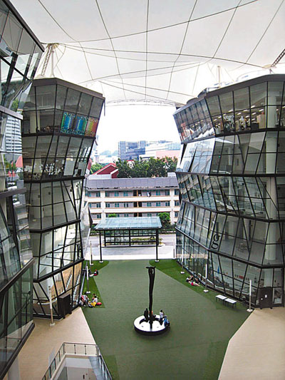 根據學院職員講解,LASALLE College of the Arts於1年多前已搬遷到小印度區的新校園,而且該校建築物更獲設計及建築獎項。筆者認為校園的設計與該校的主題配合得天衣無縫,因為校園本身已是一座大型藝術品,令人驚嘆不已。整個校園就如一個倒轉了的方形箱子,並以黑白色為主調,外牆是單一的黑色,充滿神秘感。但當你置身於校內時,便會有截然不同的感覺:從校園地面的中央廣場抬頭往上望,會看到一個透光的白色天幕(學院頂部),天然光從天幕透進校園裡,感覺柔和。另外,這座建築物最大的特色是所有學院的大樓都是通透的,不論課室、圖書館、升降機、學生餐廳等外牆也是以全落地玻璃或半落地玻璃所組成,讓人一覽無遺,筆者甚至可從地面看到位於4樓的學生作品展覽呢!