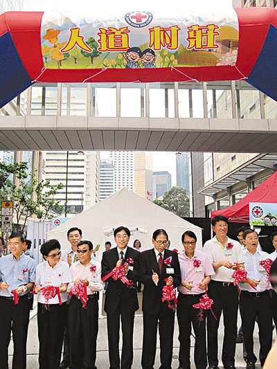 【本報訊】中環遮打道行人專用區昨日出現了一條「人道村莊」,3名穿整齊制服,精神奕奕的耆英團會員,將香港紅十字會會旗徐徐升起,揭開了香港紅十字會耆英團15周年「會操嘉年華」的序幕。