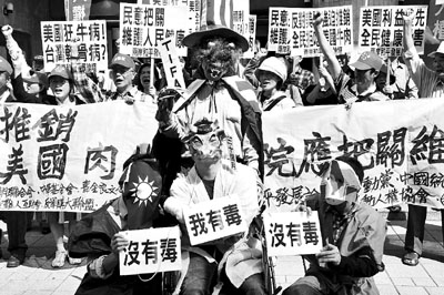 數個社會團體27日聯合至立法院,表演行動劇抗議美國牛肉進口台灣,呼籲政府維護人民健康。 法新社