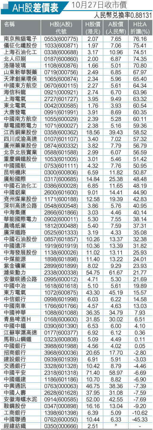 AH股差價表(10月27日收市價) (2009-10-28) (圖)