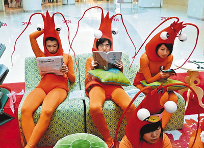 北京王府井新東安市場地下一層一個臨時搭建的12平方米的玻璃房內,7名男女青年裝扮成大蝦,在窄小的空間內讀報、看書、下棋、上網,生活了7天,以此體現「蝦米族」的強大生命力。「蝦米族」是在當今經濟危機背景下誕生的全新時尚族群。 中新社