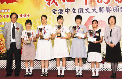 本報副社長韓力(右一)等向中學組獲獎者頒獎。