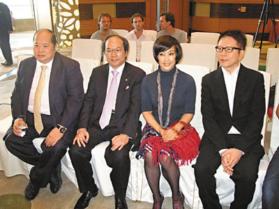 ■「亞姐」決賽三位評判:劉曉慶、戴德豐(左二)、張華峰(左)昨日近身評審眾佳麗。
