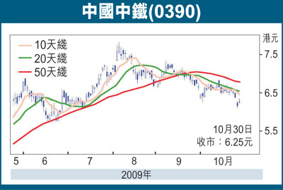 受政府財政刺激計劃和匯率風險消除的推動,中國中鐵(0390)按中國會計準則公佈的首3季度的收入和盈利分別按年增57%和263%至2,413億元人民幣和49.23億元人民幣。每股盈利0.23元人民幣,相當於本行全年預期的76.7%,和市場預期相符。第3季度轉虧為盈,每股盈利達0.09元人民幣,和第2季度一致。