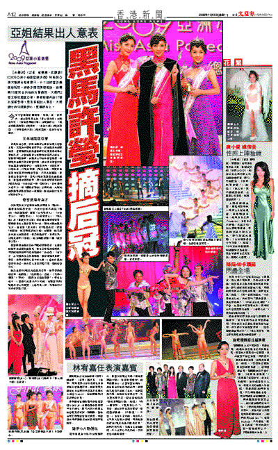【本報訊】(記者 黃佩麗、梁靜儀)《2009亞洲小姐競選總決賽》昨晚假亞視大埔總台隆重舉行,十二位候選佳麗競逐后冠。經過多個表演環節後,由黑馬15號來自內地的許瑩摘冠,大熱門2號王希瑤屈居亞軍,季軍則爆冷由17號許嘉慧奪得。賽果有點出人意表,大熱倒灶的18號劉伊心,更灑淚台上。