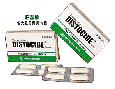 DISTOCIDE (肝蟲敵)- Praziquantel藥物產品,為世界衛生組織 (World Health Organization)廣泛使用,能於一至二日使肝臟及膽管驅走有害的肝吸蟲;服用方法請參考盒內說明書或向醫生或藥劑師查詢。