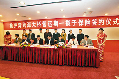 ■2008年4月23日下午,人保財險寧波市分公司作為首席承包人,與杭州灣跨海大橋業主方簽署大橋營運期一攬子保險協議。圖為協議簽署現場。