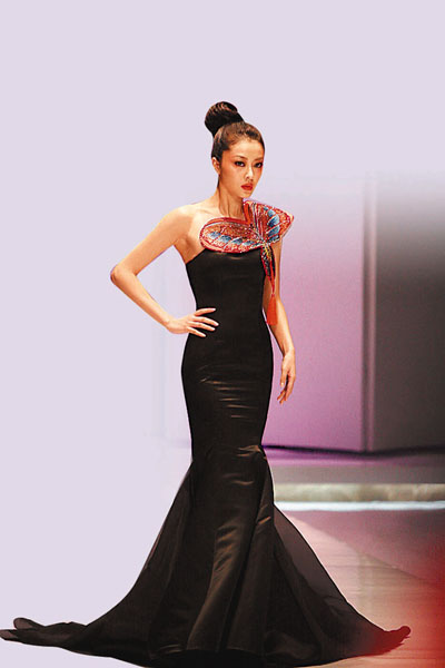 【本報北京新聞中心記者江鑫嫻3日電】中國國際時裝周日前在京開幕,香港名模熊黛林2日晚現身北京飯店金色大廳,為NE-TIGER 2010高級定製發佈會壓軸走秀。熊黛林濃妝紅唇,身穿黑色晚禮服,肩頭一隻五彩斑斕的蝴蝶十分搶眼,盡顯「天王嫂」風範。