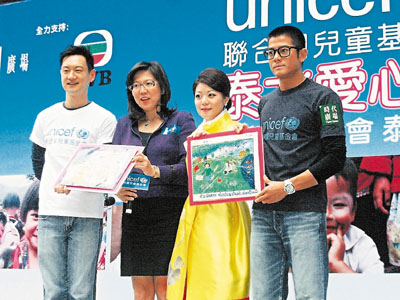【本報訊】(記者 李慶全)聯合國兒童基金香港委員會大使郭富城與嘉賓李浩林於九月曾出發到泰北湄洪頌府進行親善探訪,了解到當地有超過一百萬名失學兒童未能接受學前教育,城城在今次探訪中特別拍下「泰北愛心頌」特輯,於本月十四號晚在無線播出,從而呼籲各界人士關注。至於昨日記者會上,城城更拿出他心愛的「舞林至尊演唱會」銀色公路系列紀念版公仔於網上拍賣,從上周日零底價開始拍賣,競投至今已去到400美元,他心目中希望能去到7000美元。記者笑指不如叫熊黛林去競投,他即笑而不語。
