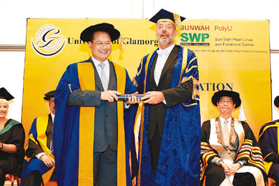 【本報訊】英國格拉摩斯大學校長霍頓教授,日前率領副校長及多名教授專程來香港頒授名譽教授職銜予新華集團主席蔡冠深博士,及主持由新華理大培訓及研發中心與該大學合辦的「第一屆電腦法證理碩士」畢業典禮。香港理工大學校長唐偉章、副校長呂新榮,理大教職員及專家均有到場觀禮。