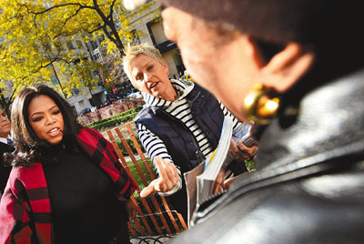 美國名嘴奧花雲費最近創立屬於自己的雜誌《O》,創刊號更邀得同屬名嘴的艾倫迪珍妮絲一同拍攝封面。為更好地宣傳,奧花雲費與艾倫昨日來到芝加哥的某公園(圖)舉行宣傳活動,又在街頭免費向首1千名市民派新書,吸引大批途人圍觀,爭相排隊索取。 ■文︰曼迪/圖︰美聯社