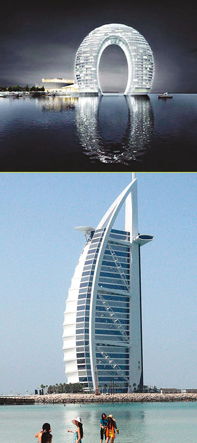 位於太湖南岸的浙江湖州將興建中國首座水上白金級酒店(上圖,效果圖)。據介紹,該酒店佔地75畝,總投資約為15億元人民幣,距離上海150公里。高100米,寬116米的指環形建築堪比迪拜著名的七星級「海邊帆船」酒店(左下圖)。酒店將於2011年下半年開業。 ■《揚子晚報》