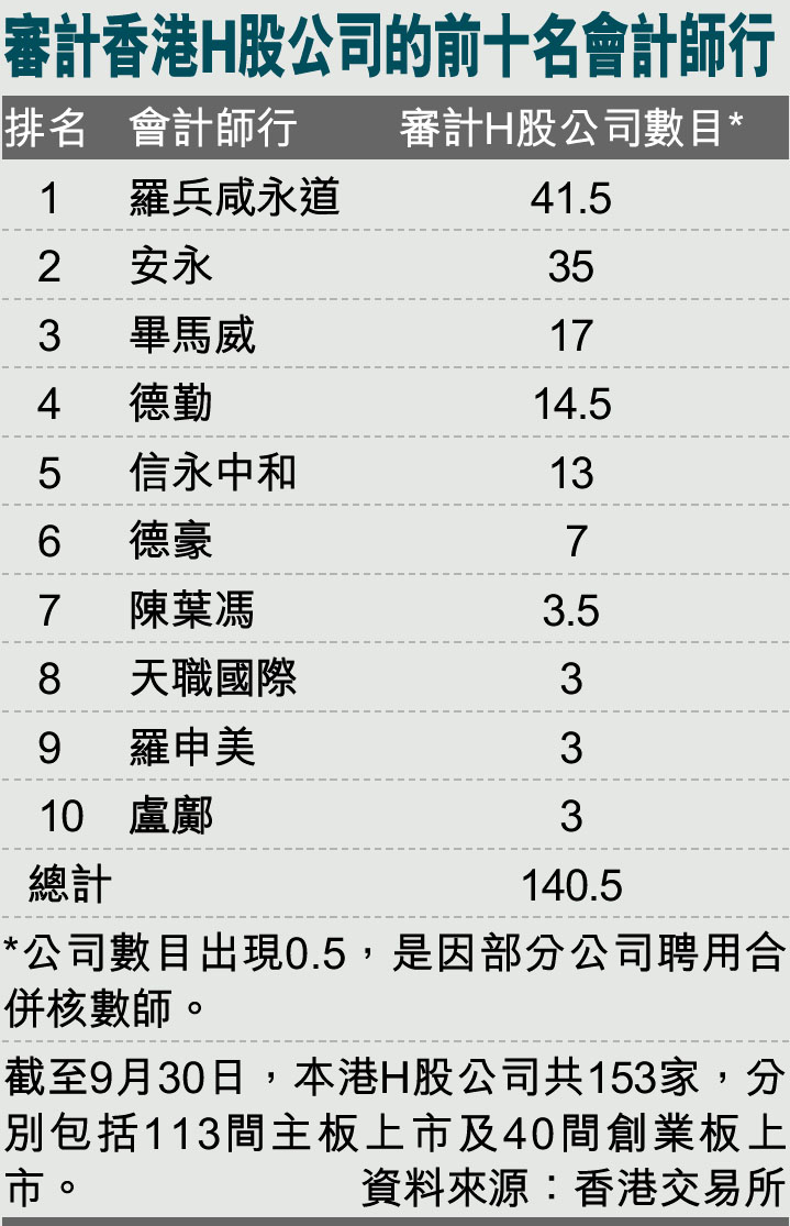 審計香港H股公司的前十名會計師行 (圖)