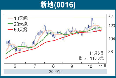 雖然新地上周走疲,不過收市價已收復50天線(114.48元),而離10天線(116.54元)也只是一步之遙,在走勢有所改善下,該股仍值得留意。此外,該股年高位曾見過130元,其現價較高位回落幅度仍達1成,在股價仍然超賣下,論值博率仍在,可趁低吸納,中線博反彈仍睇130元。