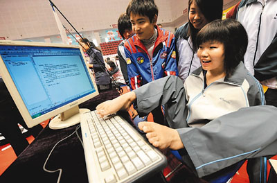 8日,江蘇省殘疾人職業技能競賽在南京開幕,420多名選手展示了精湛技能。圖為一殘疾女孩在用腳打字。新華社