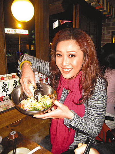 ■周麗淇用手撈石頭飯。
